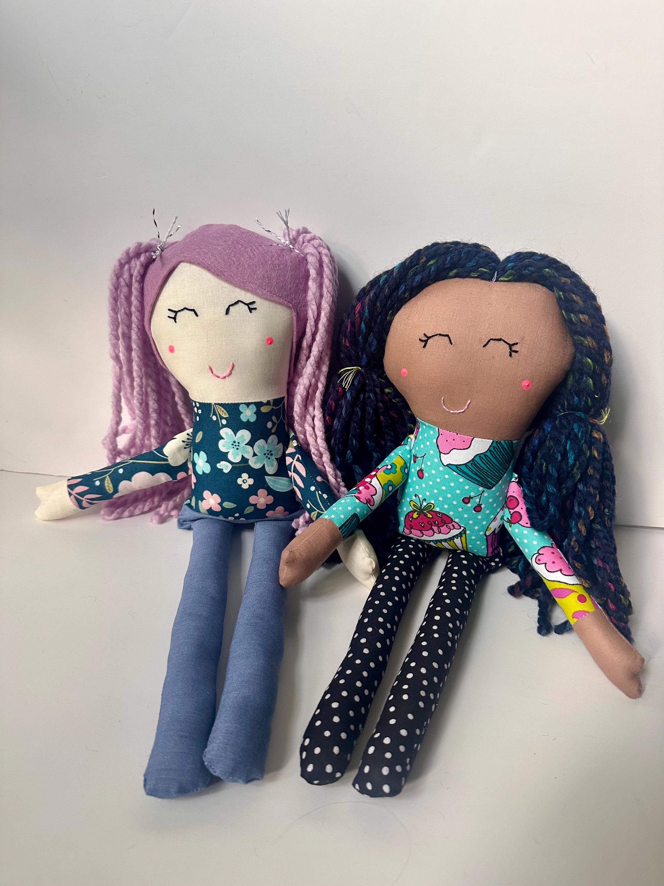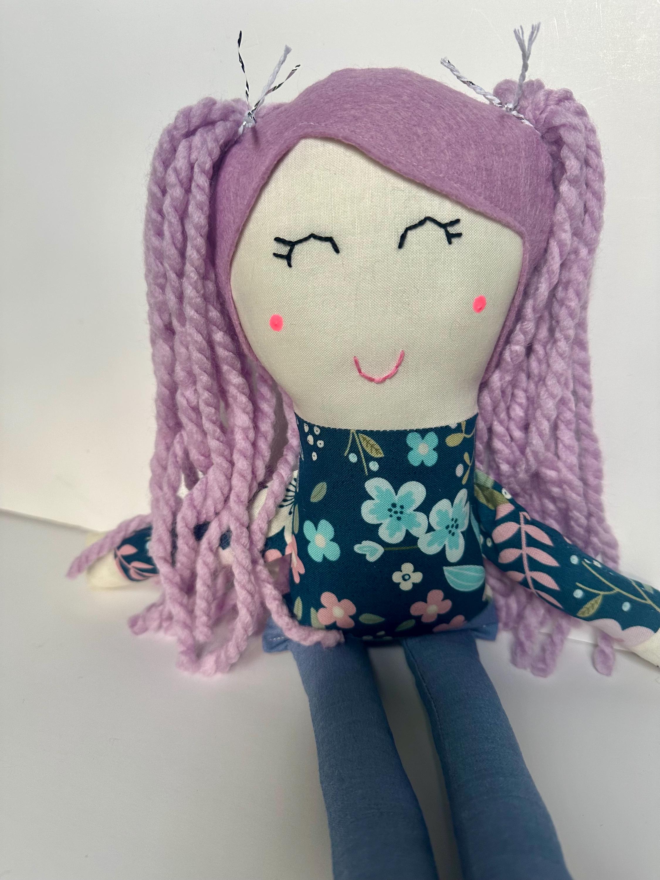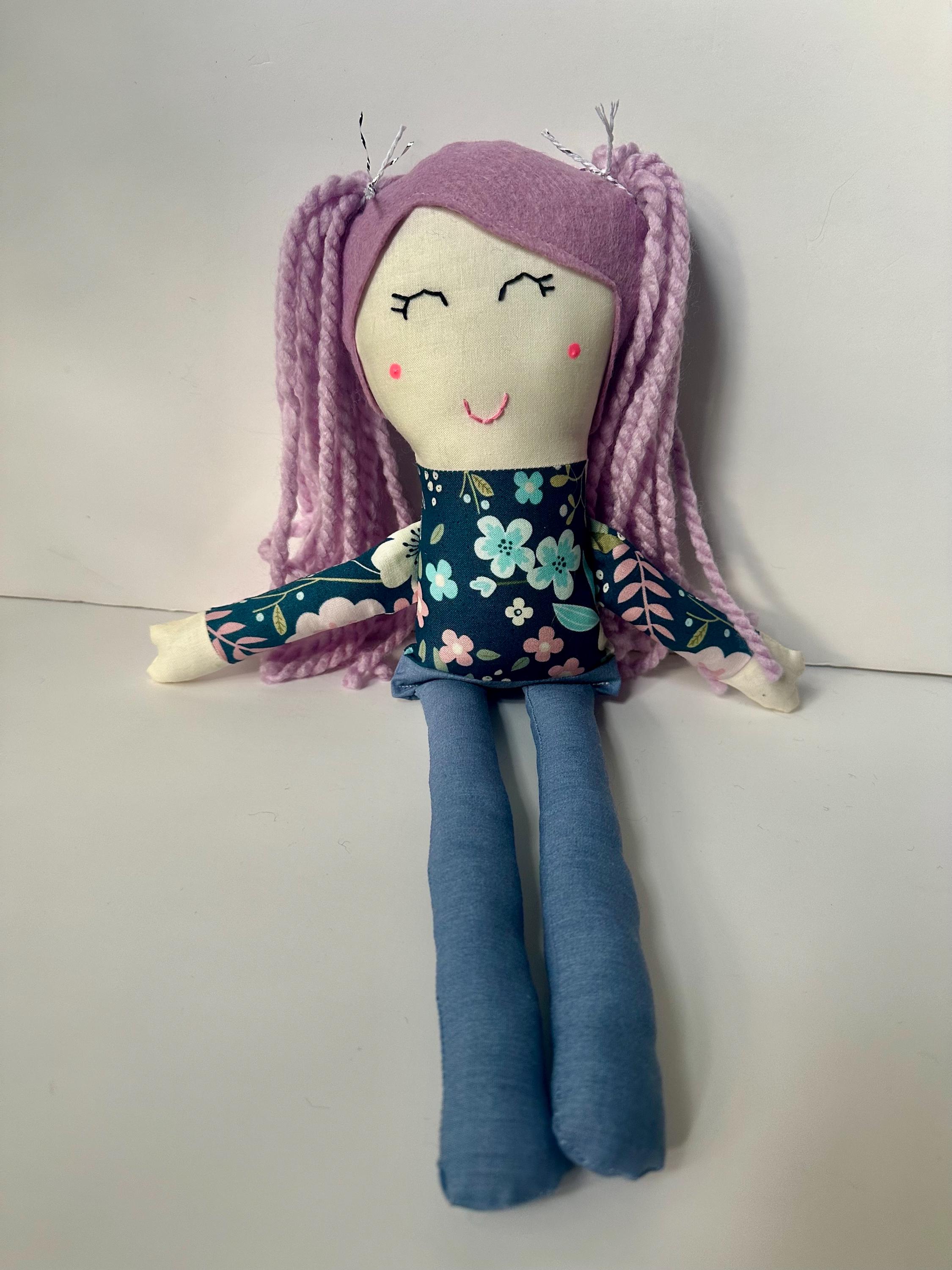 This unique lilac-haired cloth doll / rag doll is decked out in her finest: a fun floral patterned top and jean pants! She is about 10" tall and stuffed with hypoallergenic polyfil. Her eyes and lips are hand-stitched with love. Her thick yarn hair is tied off with string. This spunky doll can be hand washed with water and mild soap.