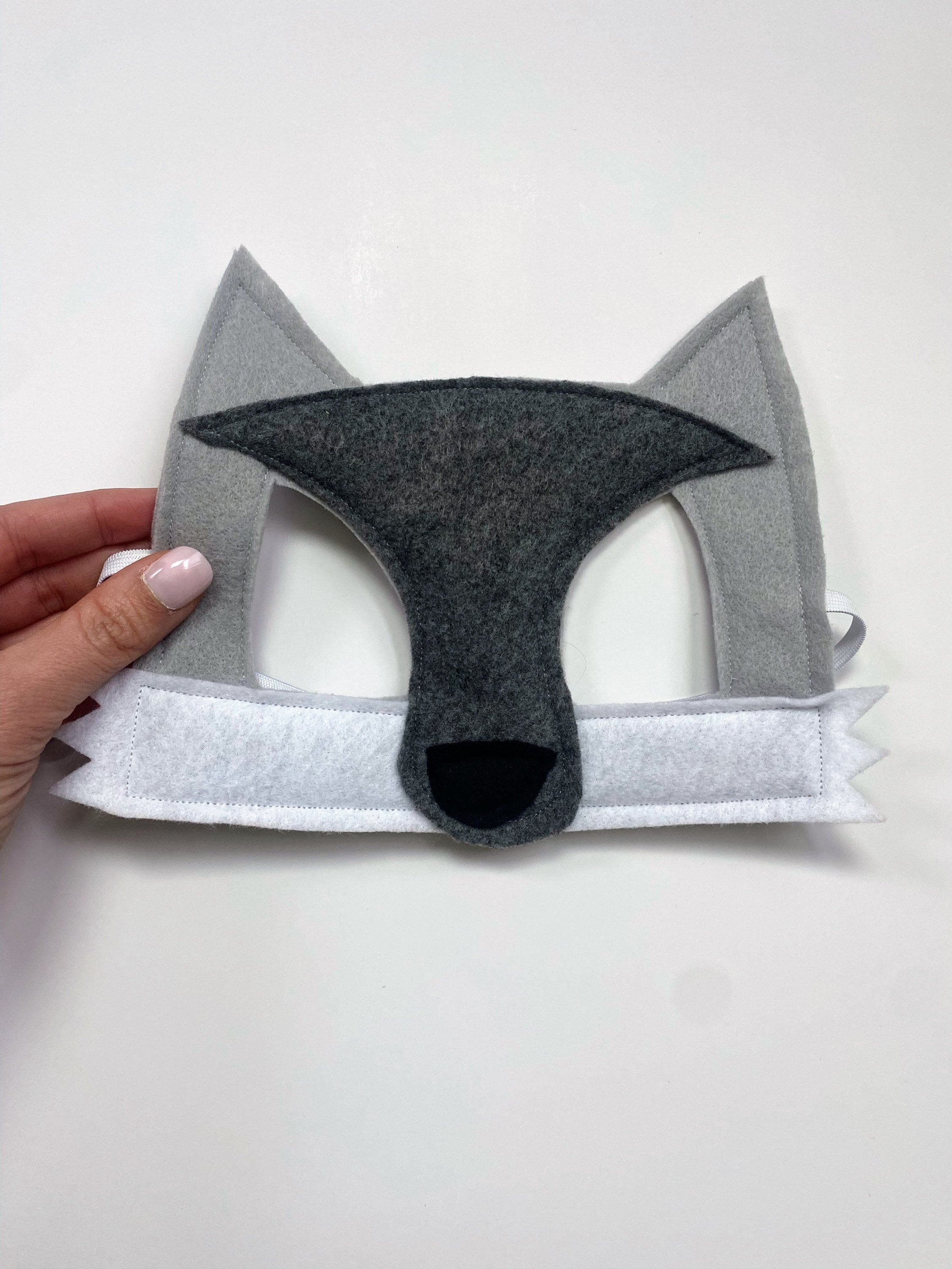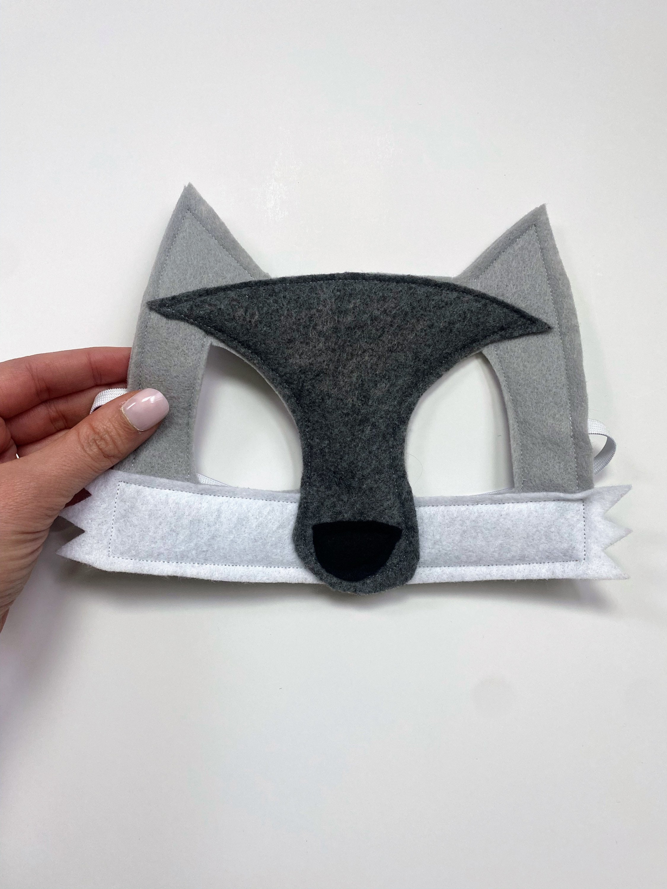This felt gray wolf mask is sure to delight and inspire the kid in your life! The mask is 7.5" wide and 6" tall and the elastic is 10". The gray wolf mask can be hand washed with water and mild soap when necessary.